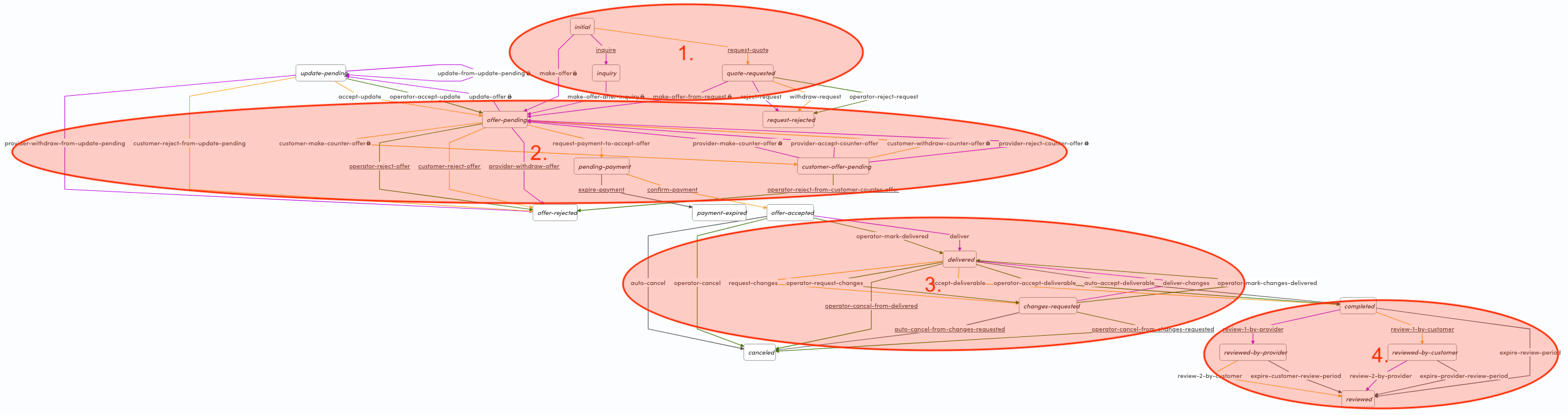 In the transaction process graphs in this article and in Console, orange arrows show transitions defined for the customer, and purple arrows show transitions defined for the provider. Green arrows show transitions defined for the operator, and grey arrows show automatic transitions.